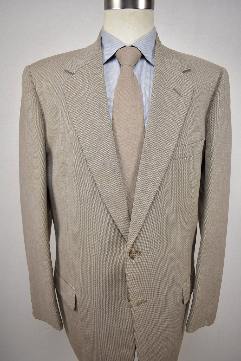 | Condition: | Item is in fair condition. It may have small flaws that may affect the wearabilty of the item. You may need to repair the garment prior to wearing. Light soiling on left thigh of trousers. Small hole back right cuff. |